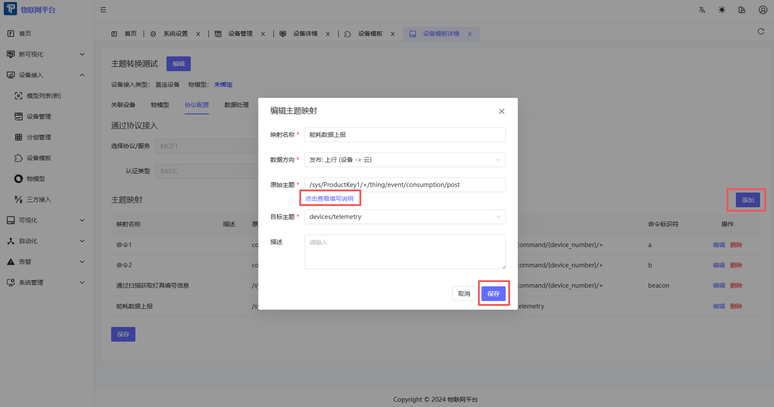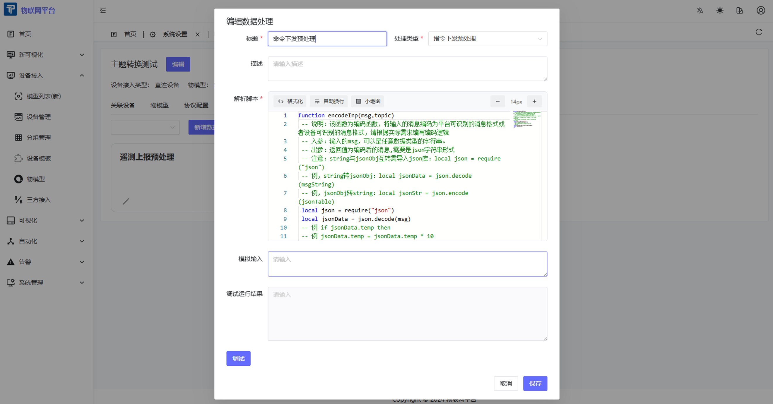 - 选择处理类型:上报数据预处理:处理设备上报的遥测数据