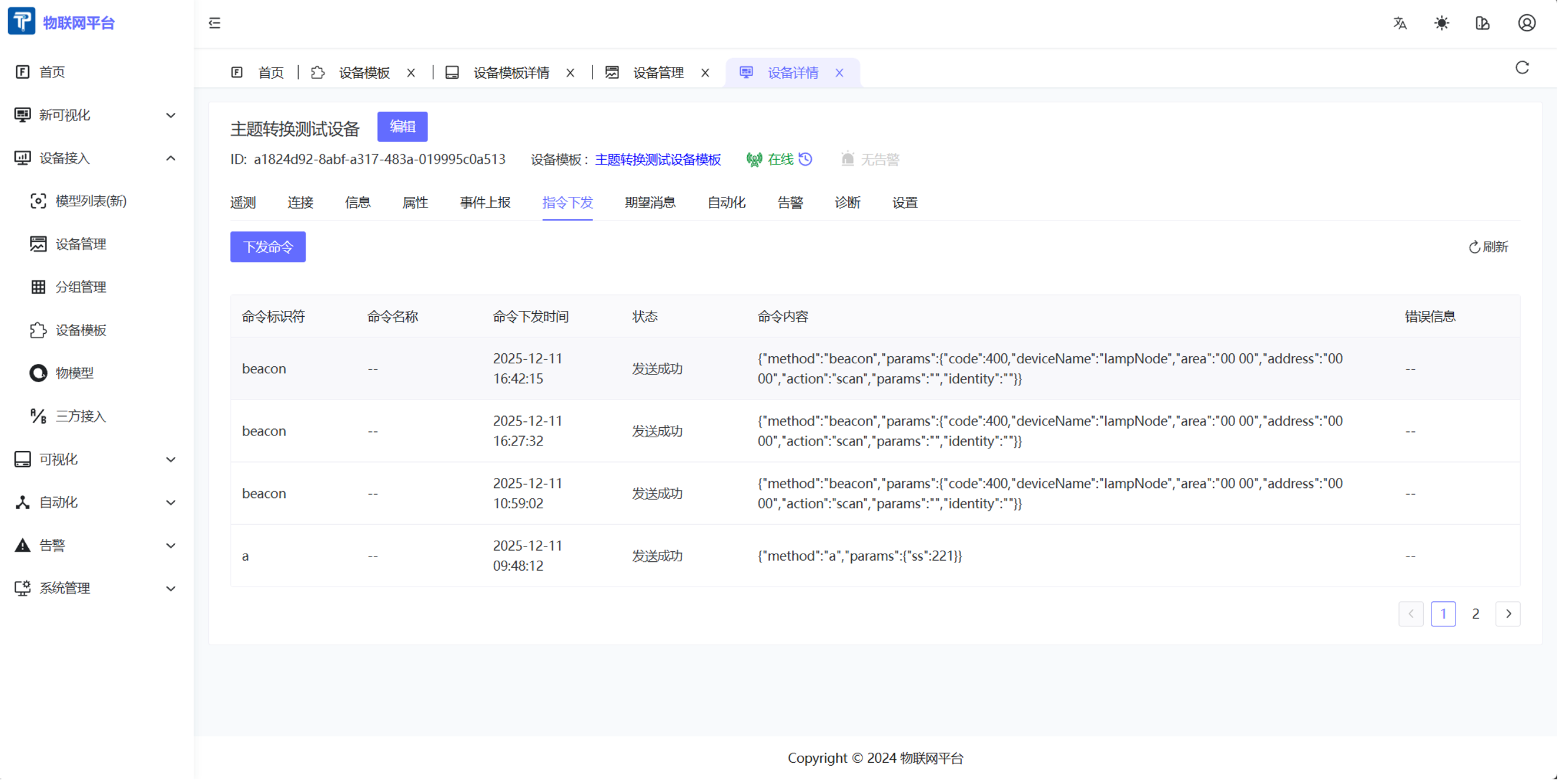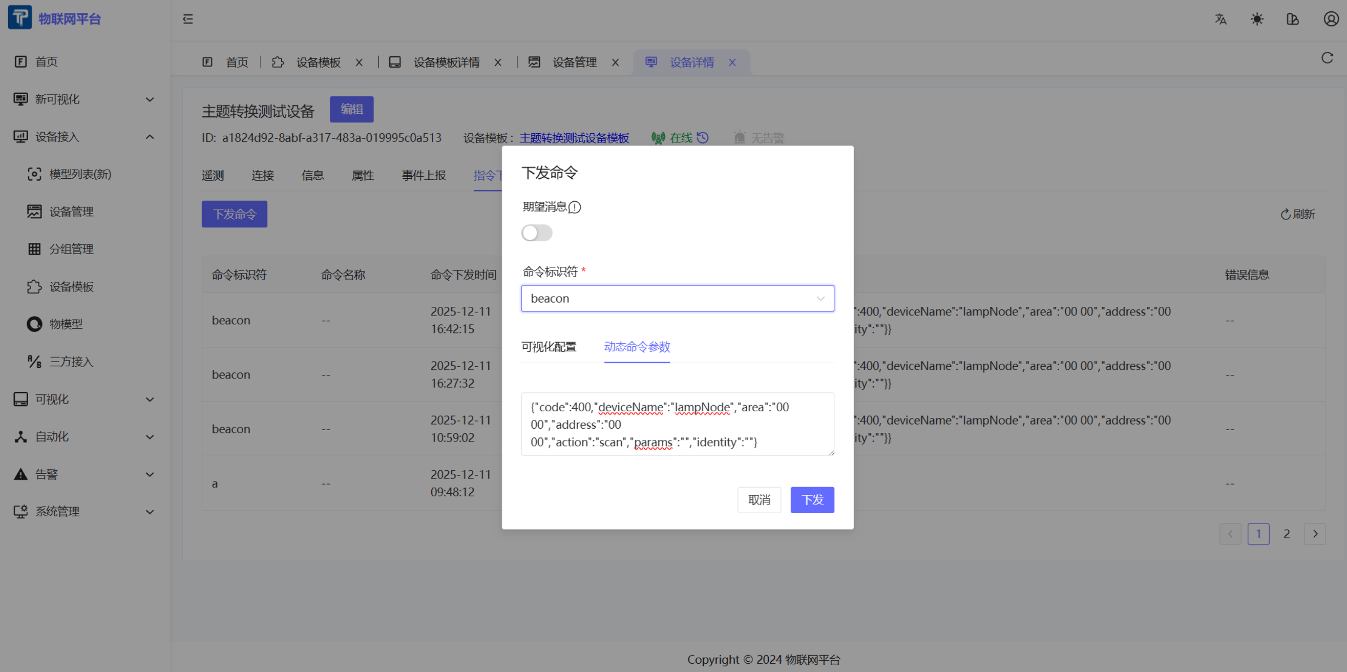 自动带了method:beacon,注意下发命令的时候不需要有这一层。
