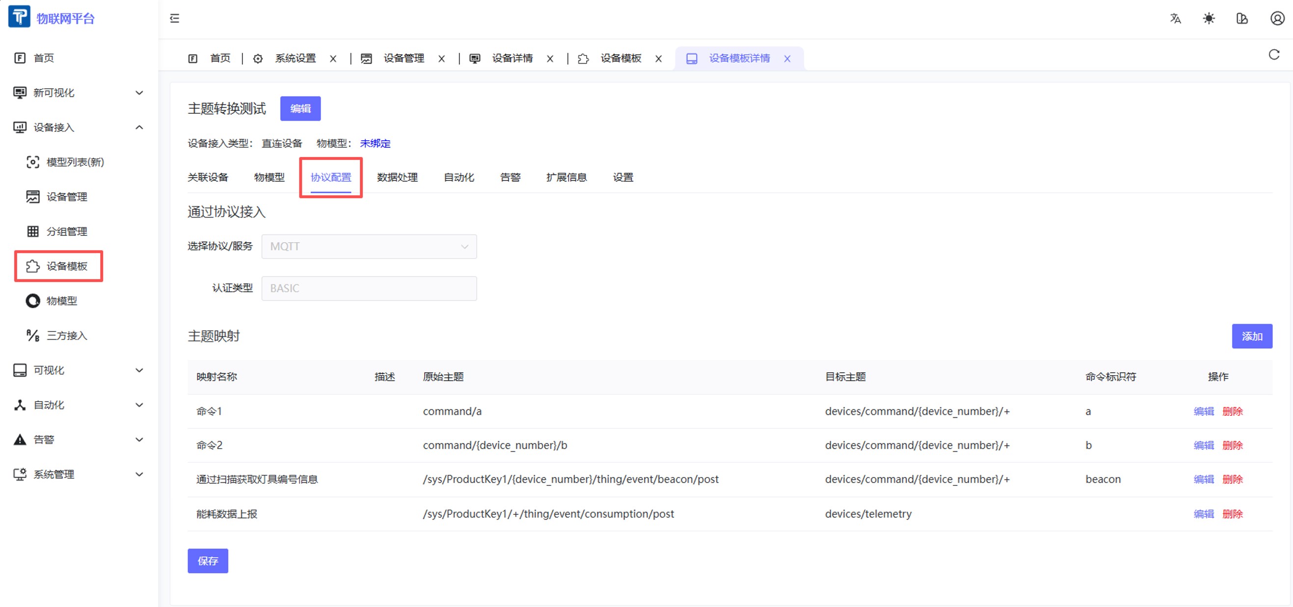 在设备模板详情页,点击「数据处理」标签页