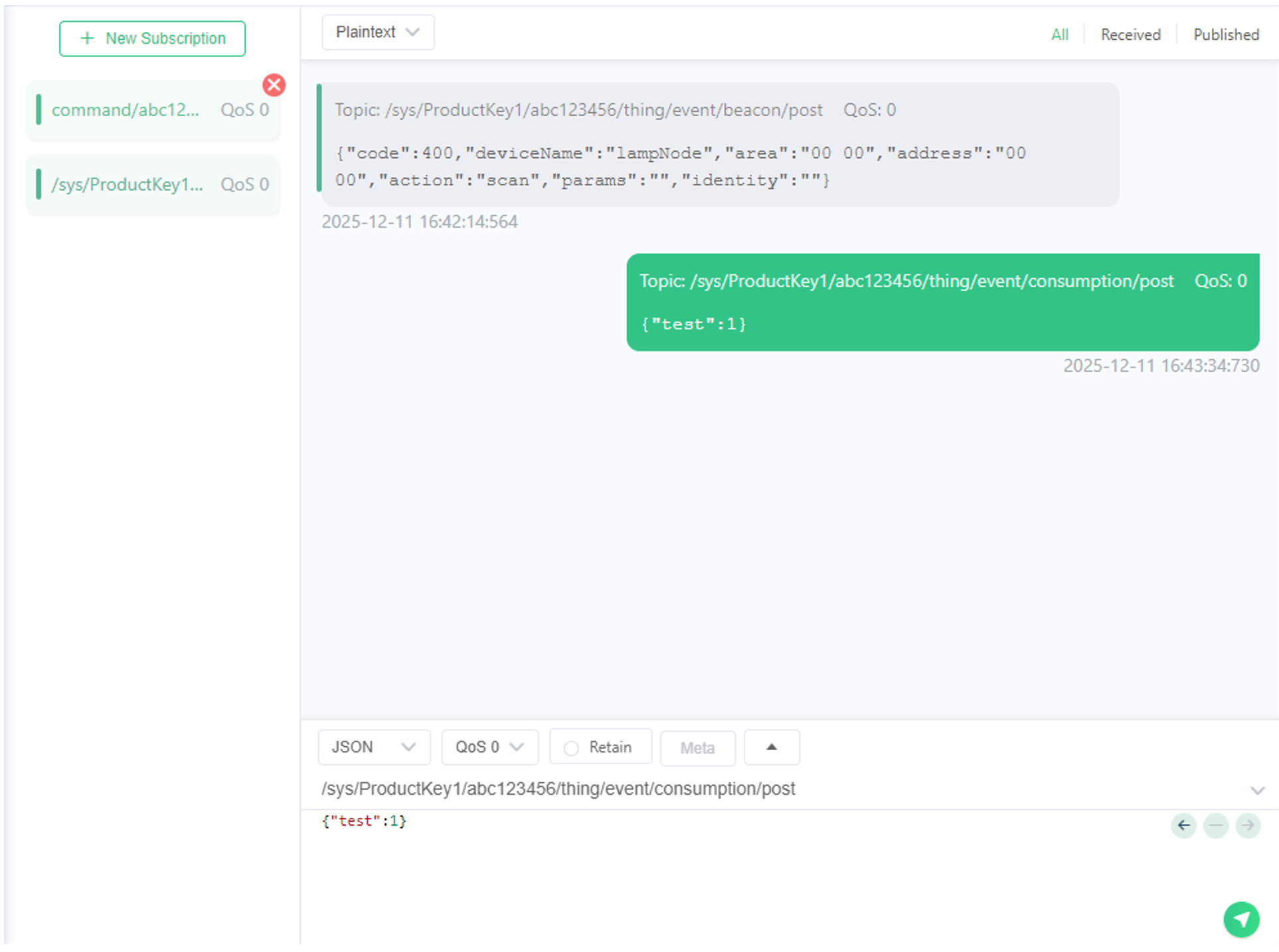 2、 /sys/ProductKey的报文是上报遥测给ThingsPanel,发送了一个数据test,值为1